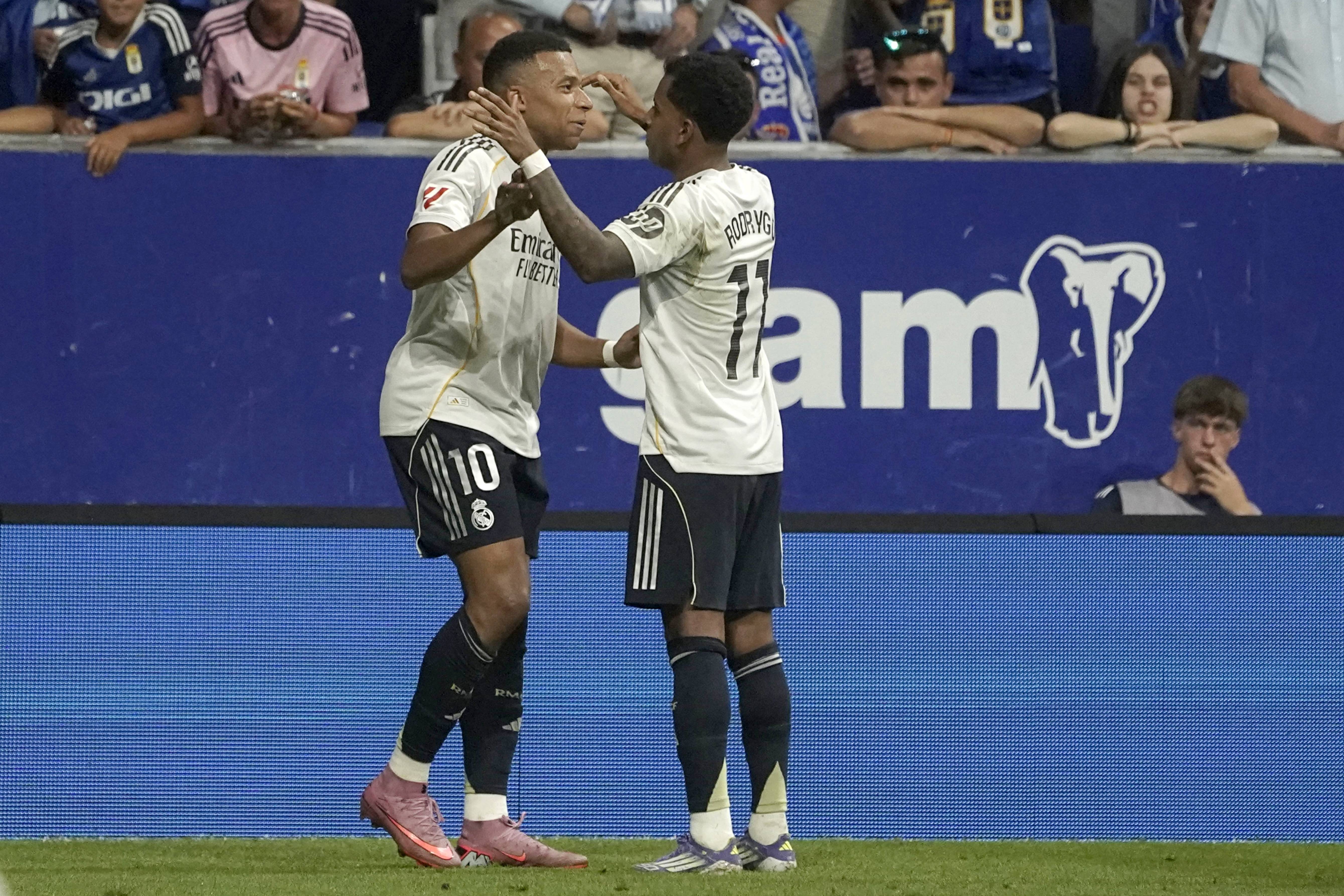8月24日,皇家马德里队球员姆巴佩(左)攻入球队首球。 新华社/欧新