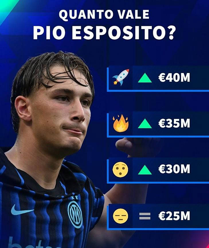 下个月,德转将更新意甲球员身价,国米年仅20岁的小将埃斯波西托的身价预计将大幅上涨。